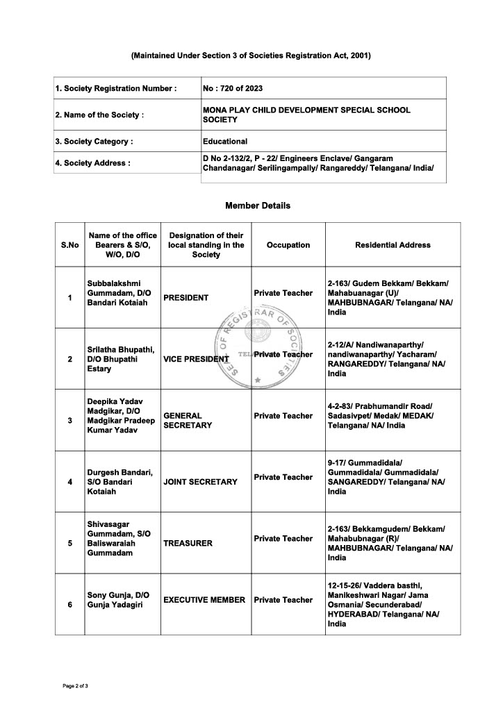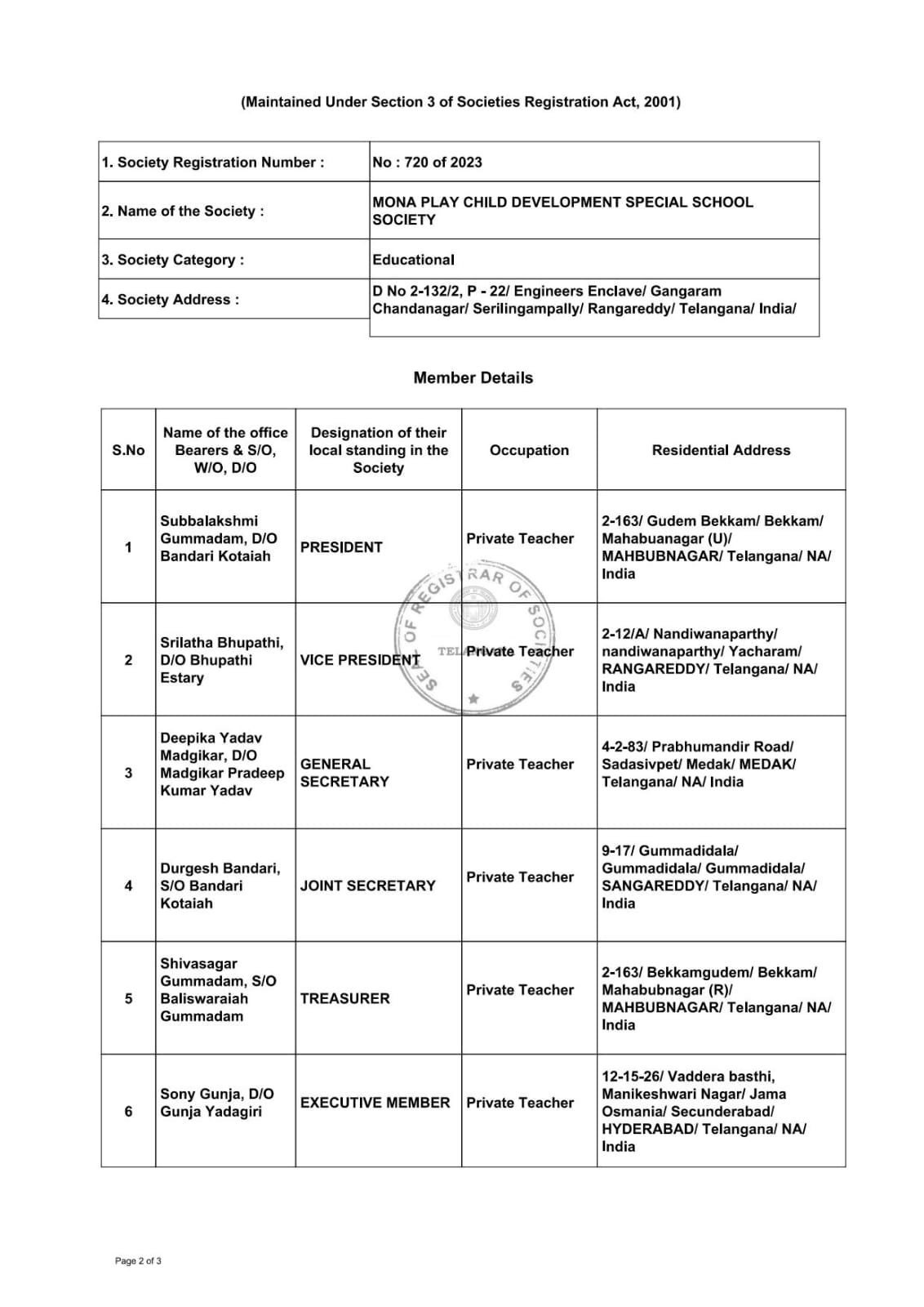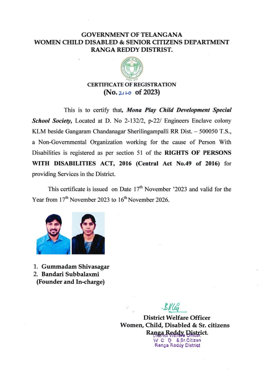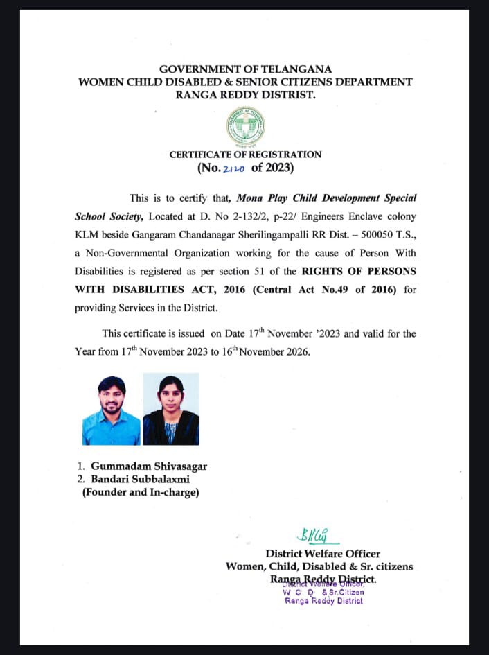 Mona Play Special Children Society, guided by Mr. Gummdam Shivasagar (D.Ed, MR, DPT, Child Psychology, Special B.Ed, Adolescent Child Psychology), is committed to supporting children with special needs through structured therapies and inclusive education. Our services include Speech Therapy to enhance communication, Occupational Therapy to improve motor and daily living skills, and Behaviour Modification Therapy (ABA, CBT) to build positive behaviours. We also provide Special Education and Inclusive Education for holistic learning. Additionally, we offer a Hostel Facility for Autism, ensuring safe, nurturing residential care that fosters growth, confidence, and independence.